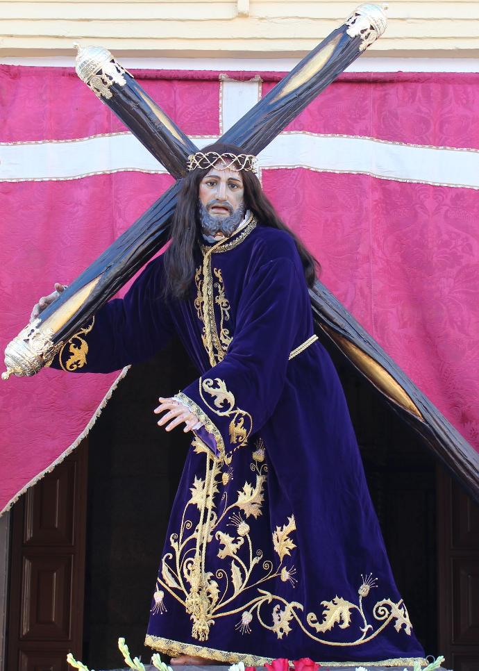 Esta túnica fue estrenada con sobrepuestos en plata, desde el principio se observaron problemas en la confección y se le pidió permiso a la donante (C.L.G.), que la envió desde Barcelona, para poder cambiarle los sobrepuestos plata por encaje de concha en oro para que imitase a la túnica morada antigua, y poder así ponérsela al Señor cuando esté en su camarín. Dados todos los permisos la túnica fue adaptada por P.V.R. en 2017. Desde entonces es la que luce el Señor de diario.