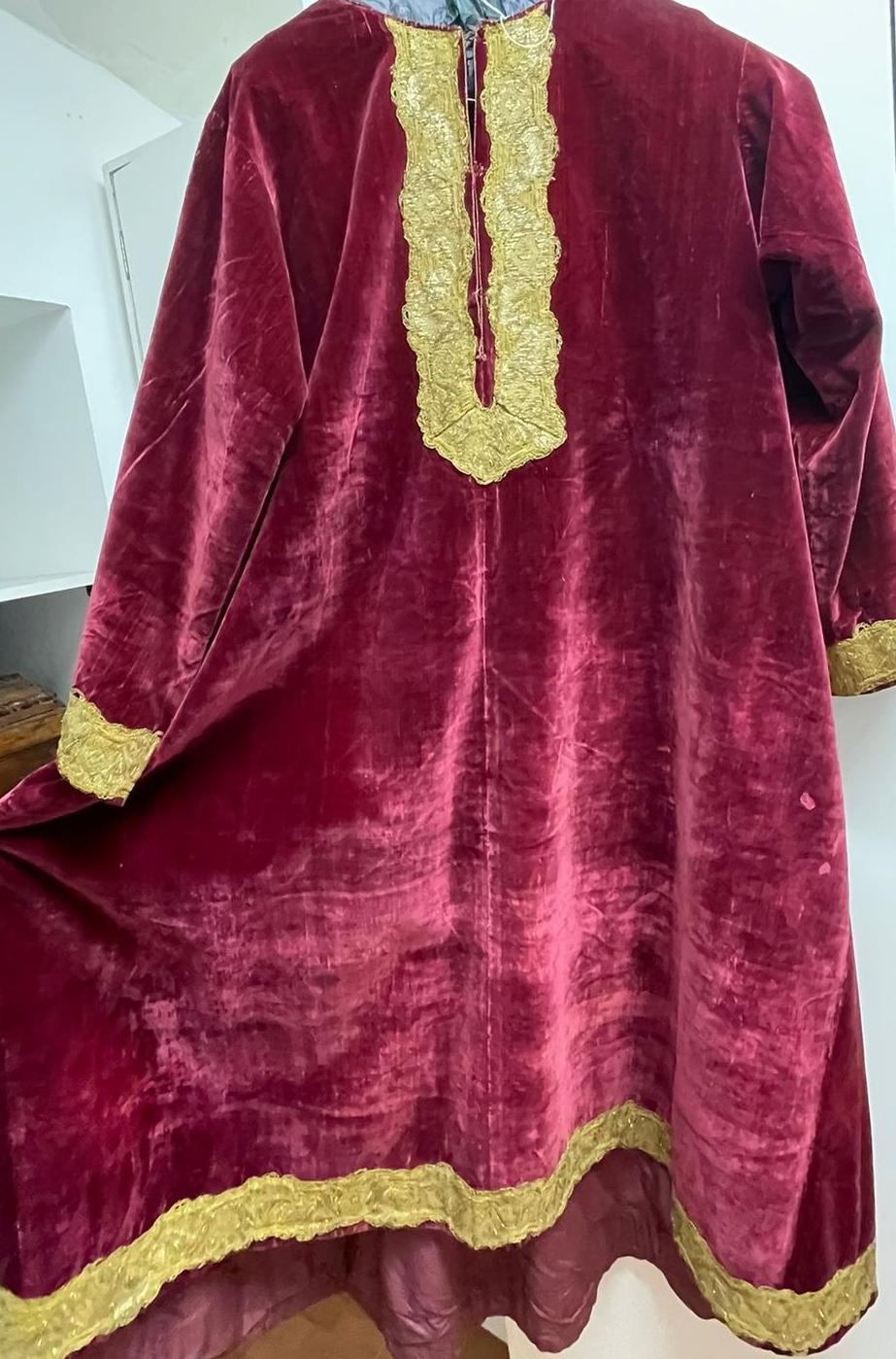 Muy antigua, el terciopelo parece consistente y bueno, el adorno de remates en bajos, mangas
